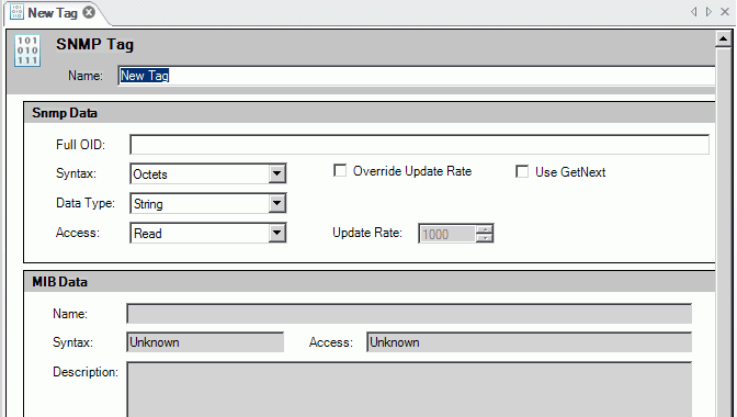 Name: Enter the name of the SNMP Tag. The name of the tag is critical. For Scalar Values, Table Tags and Array Tags (see Exploring the Network), you can change the name of the tags, without limits. For array elements, it is really dangerous to change the ending part of the name because it contains information about the Full OID itself.