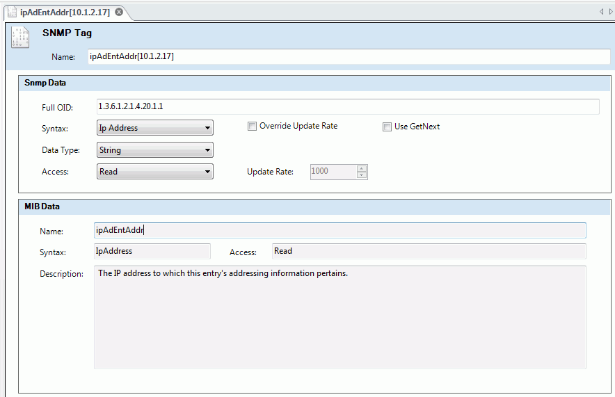 In the example above, the name of the tag is composed by the SNMP Item name and the index of the Array (which is the IP Address 10.1.2.17). To retrieve in runtime the value of the tag, the Full OID "1.3.6.1.2.1.4.20.1.1" (which is the same Full OID of the SNMP Object ipAdEntAddr ) and the index of the Array "10.1.2.17" are concatenated to obtain the real "address" of the information: "1.3.6.1.2.1.4.20.1.1.10.1.2.17". If the index is changed or deleted, the data will not be retrievable anymore. However you can change the index coherently to obtain different elements of the array.