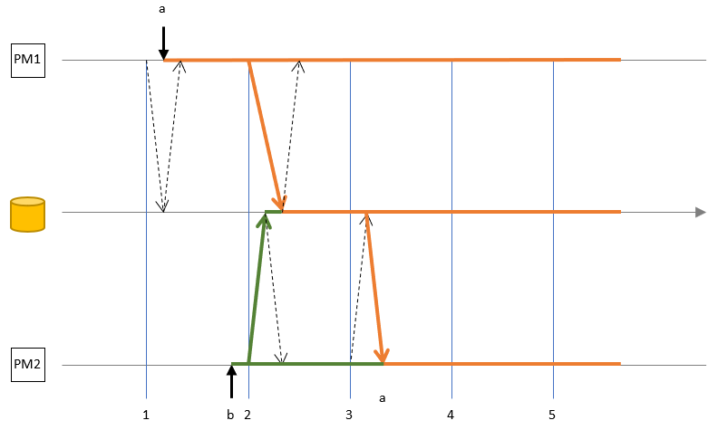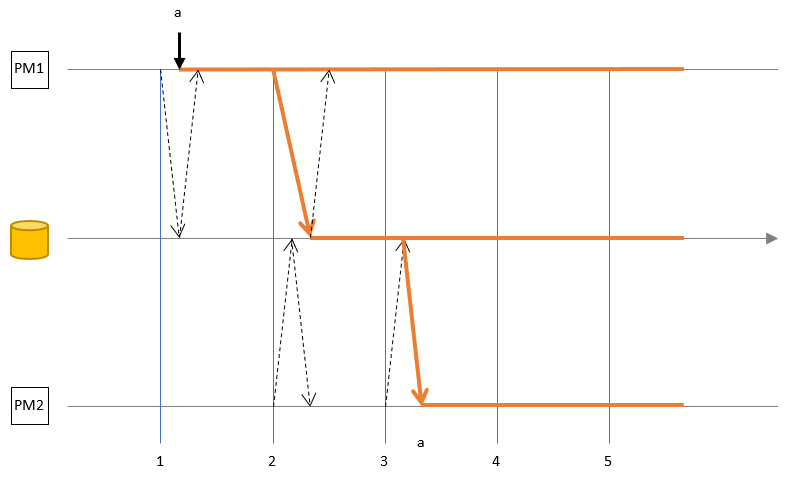 In this scenario, there are two AssetWorX point managers connected to the same store, and a client writes the value “a” to a static Equipment Property on Point Manager 1 (PM1). The horizontal line represents time, and the vertical lines represent events, when the AssetWorX Point Managers start synchronizing with the database. The dotted arrows represent events when the Point Manager would read from or write to the cache, if there were any data changes. Only a few of the dotted arrows are drawn to not clutter the diagrams too much.