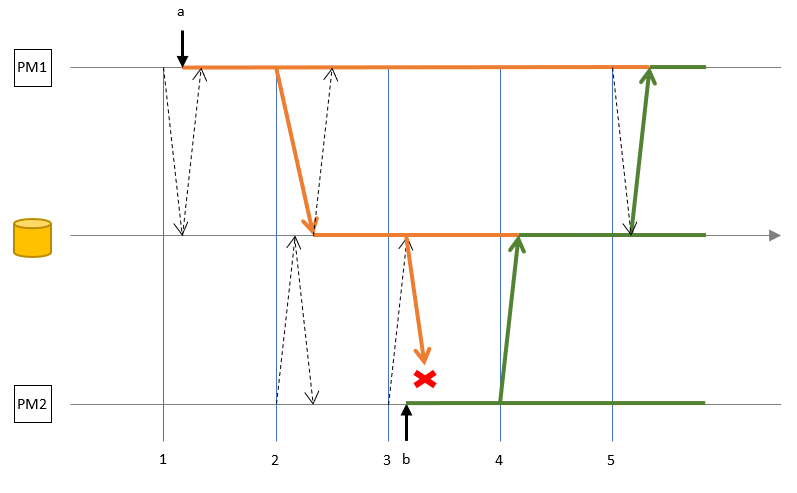 In this scenario, the client wrote to PM1 shortly after it started updating the database table, so the value gets written on the next synchronization event.