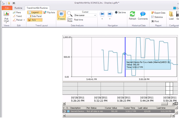 If a user wants to review all loaded data (for example, data which are beyond the actual real-time period) in detail and without continuously updating, he or she can 'Freeze' the control by clicking the appropriate button in the ribbon, after selecting the control in Runtime mode (as is specified in Steps 1 and 2 of "Real-time Mode").