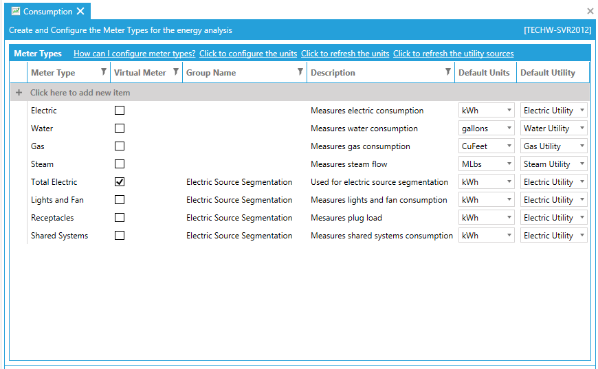 Virtual: Virtual meter types are utilized to allow energy calculation definitions based on different meter types. Typically, an energy calculation applies to a specific meter type, such as electric. When using virtual meter types, an end user can define an energy calculation, which may involve entities such as electric or water using measures such as gallons or kWH, for example.