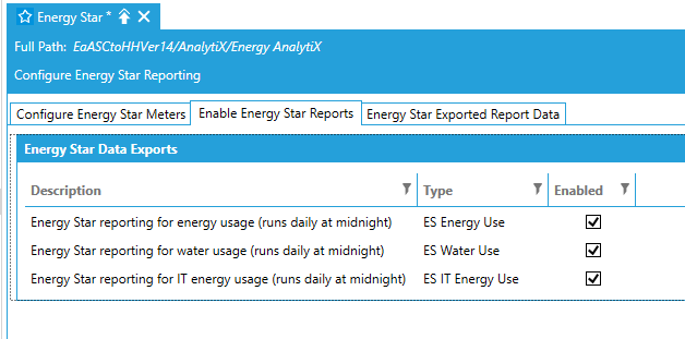 The user can enable the periodic data exports for Energy Star reporting by using the Energy Star Reporting tab of the Energy Star node in the Workbench.
