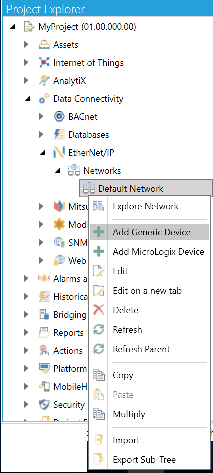 Open the Workbench then expand your project in the Project Explorer, then the Data Connectivity node, and then the Ethernet/IP node, and then the Networks node. Right-click on your selected network, then click on Add Generic Device, as shown below.