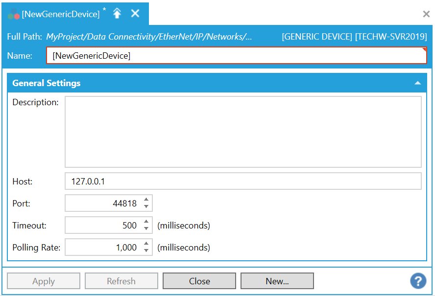 Host - Enter a host location (e.g. IP address, etc.) in the text entry field for the Generic Device.