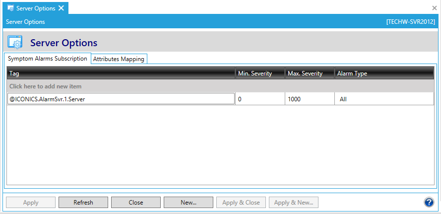 The Server Options node in the FDDWorX Provider in Workbench allows users to set options for Fault Alarms, Symptom Alarms and Attribute Mapping.
