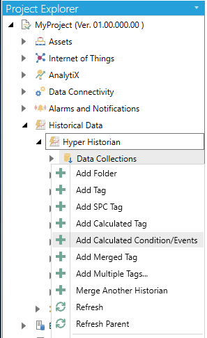Right-click the Data Collection node in the navigation tree, or any of its sub-nodes, and select Add Calculated Condition/Events, as shown in the figure below.