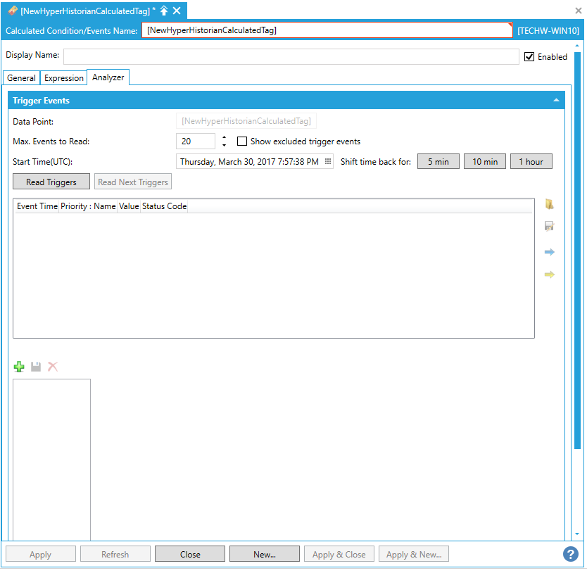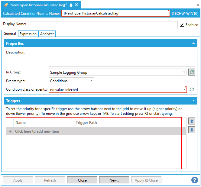 This opens the Hyper Historian Calculated Condition/Events properties window, shown below, beneath the Project Details section in the Workbench. Enter a name in the Calculated Condition/Events Name text entry field. The name should be short. It is used as a part of the browse name, and for that reason, you want to keep it short. The Display Name field, not the Name field, is where you want to provide lengthy detail so that the Name field is not long. Tags are logged with the browse name that you provided in the Name field, so you want to keep the name short.