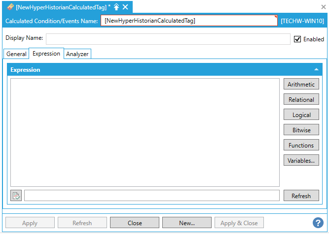 The Expression tab in the Calculation Condition/Events Properties includes the full functionality of the Expression Editor tool that is used throughout multiple ICONICS components and tools.