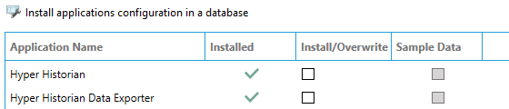 On the Install applications configuration in a database page, check to see if the Installed column is checked for the Hyper Historian Data Exporter. If it is already checked, you can cancel out of this dialog. If it is not checked, check the Install/Overwrite box for the Hyper Historian Data Exporter, then click Install.