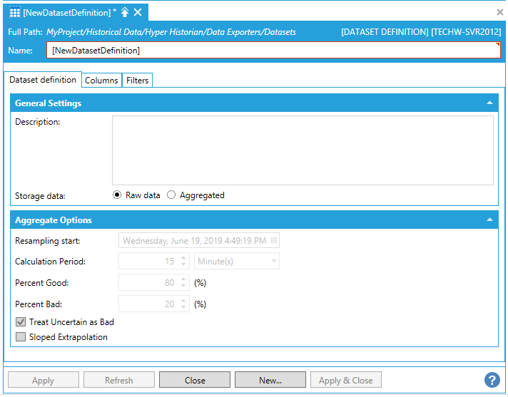 This opens the Dataset Definition properties, as shown below. Enter a Name for the Dataset Definition properties in the text entry field.