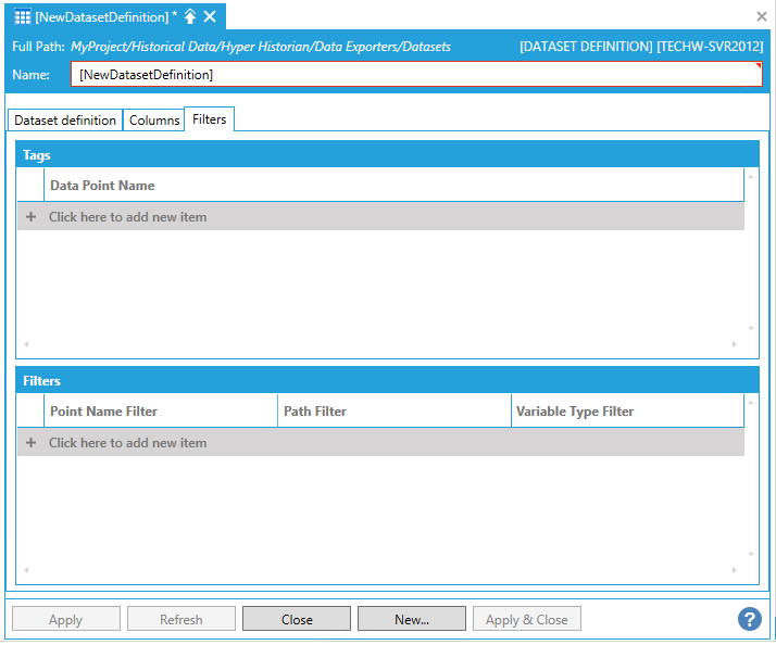 Point Name Filter - String representing data variable name. May contain wildcard characters (*, ?, #, []). For example, you can have something like <<Tag>>* used and if the user will specify <<Tag>> = Sine, as an alias, then every tag like Sine*(SineSlow, SineMed, SineFast) from path specified in PathFilter will be used in data set.