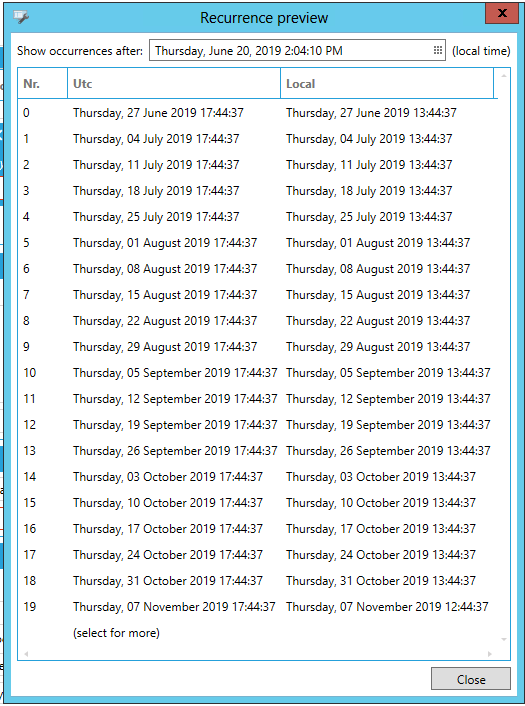 button to open the date/time picker and select your preferred date and time. The results will be shown in numerical order with both Utc and Local times. Clicking either column header will sort the recurrences by that setting (either Utc or Local).