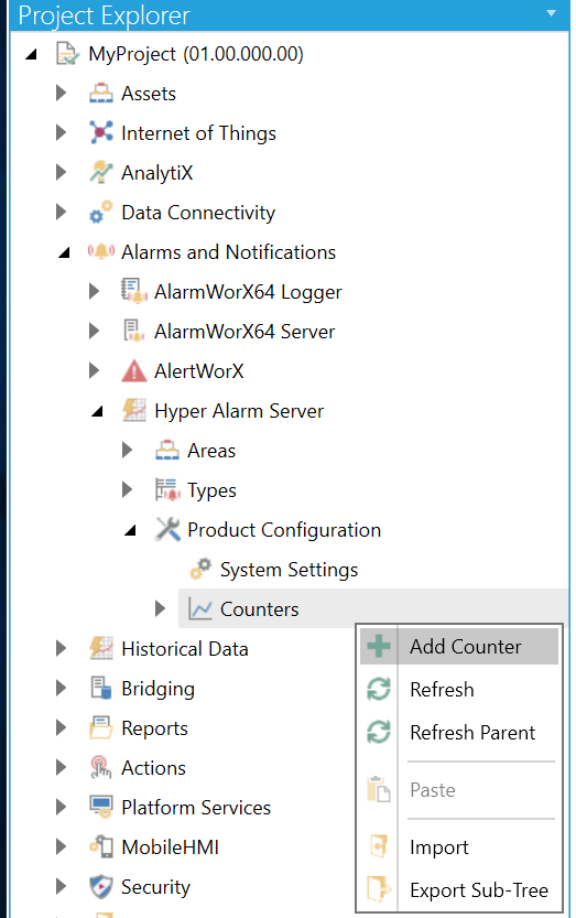 Start the Workbench, then expand your project. Next, expand the Alarms and Notifications node to show the Hyper Alarm Server node. Expand the Hyper Alarm Server node and then Product Configuration to show the Counters node