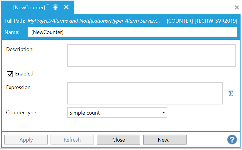 Enabled - Default is true. Uncheck if the counter should not be processed by the Hyper Alarm Server runtime, but you do not want yet to entirely delete the counter.
