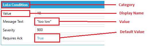 Add in the properties for this new alarm type. The string parameters (such as message) need to be surrounded by double quotes. An example of a configured alarm is below.