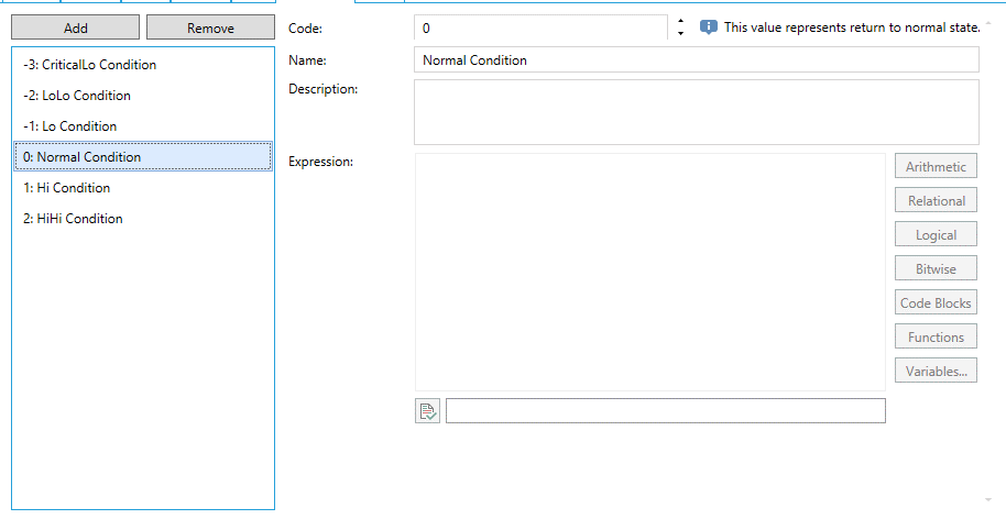 The Conditions tab is used to create the different conditions for alarms. The result of the expression on the General tab is matched to the code of one of these conditions to determine the condition or state of the alarm.