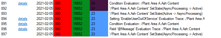 Clicking on one of the details links will show the expression evaluation trace which breaks down the expression for the alarm itself. This is useful for seeing the result of the expressions for the alarms.