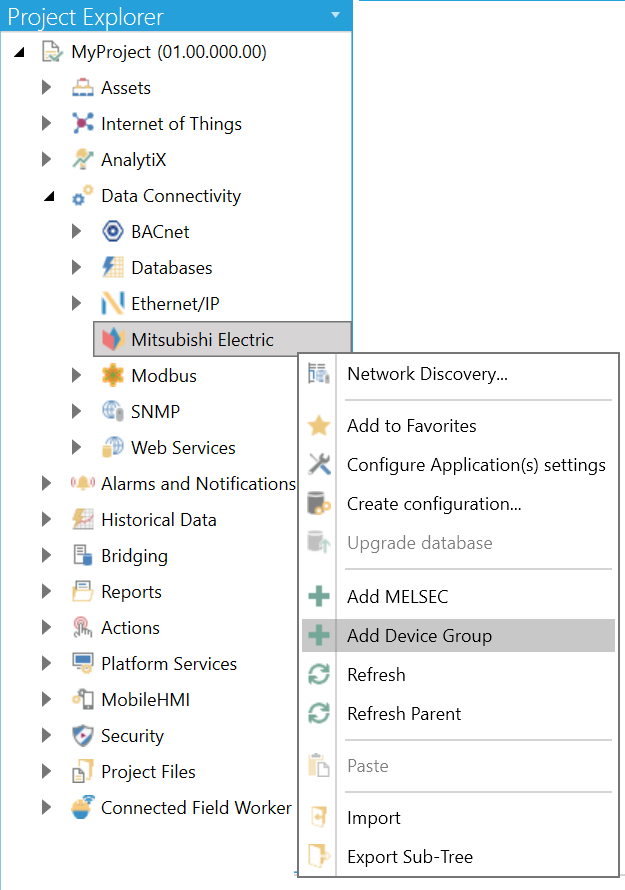 1. In the Workbench, expand your project, and then the Data Connectivity node. Right-click on the Mitsubishi Electric node, then click on Add Device Group as shown below.