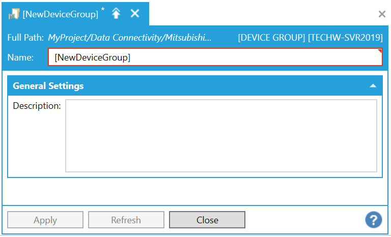 The Mitsubishi Electric device can be configured through a provider within the Mitsubishi Electric node of the Workbench, and allows for the collection of devices in Device Groups. These groups can help in the sorting and arrangement any of the discovered or added MItsubishi Electric devices configured through the Workbench.