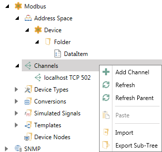 A folder can contain additional folders and data items. The data items are always the branches in the tree control hierarchy. Setting up a device requires configuration of its unique address, type, timeouts, and optimization parameters.