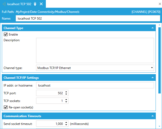 Channel Type - Use the pulldown menu to select Modbus TCP/IP Ethernet. The remainder of the properties to complete will update according to the selection.