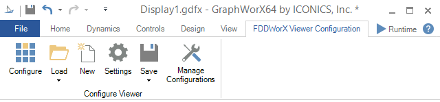 The ribbon's buttons are used only in an FDD Viewer that has been added to the GraphWorX display. Each button on the ribbon, as well as the configurator that the ribbon opens, is described below.