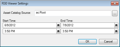 Settings: Opens the FDD Viewer Settings pop-up dialog, where you can select the computer and database for your Asset Catalog Source and specify the start and end times for the time interval containing the fault detection and diagnostics data that appear within the viewer.