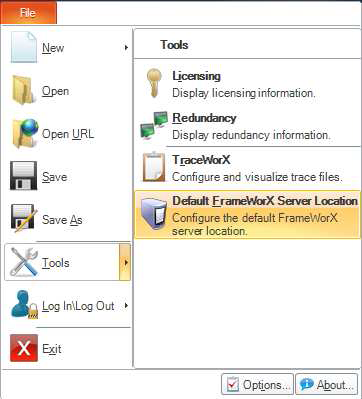 Click the File menu and go to Tools -> Default FrameWorX Server Location.