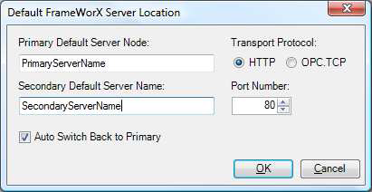 Change the Primary Default Server Node from “localhost” to the name of your primary FrameWorX server. If you have a secondary FrameWorX server enter that name into the Secondary Default Server Name.