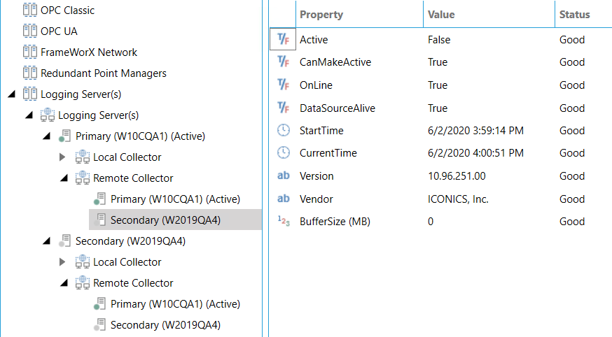 From Services, stop the ICONICS Hyper Historian Logger service on the primary logger and verify it is offline through the redundancy viewer. Also verify that the secondary logger has become active and is now logging data from the primary collector.