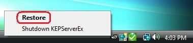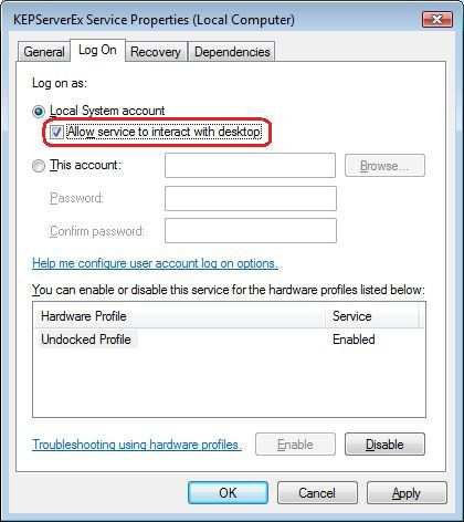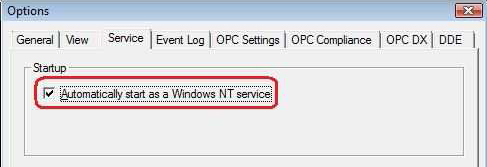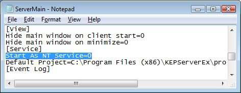 Similar steps as in the previous case need to be performed to start the Kepware KEPServerEx server as NT service. Please see the sections “Using GUI” and “Using INI file” above.