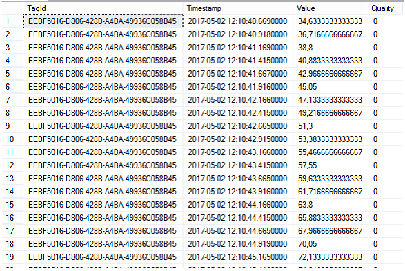 If we modify configuration file from previous example by changing TagIdColumnIndex and IdColumnDataType as shown below, integer based tag id can be used to identify values in the output table: