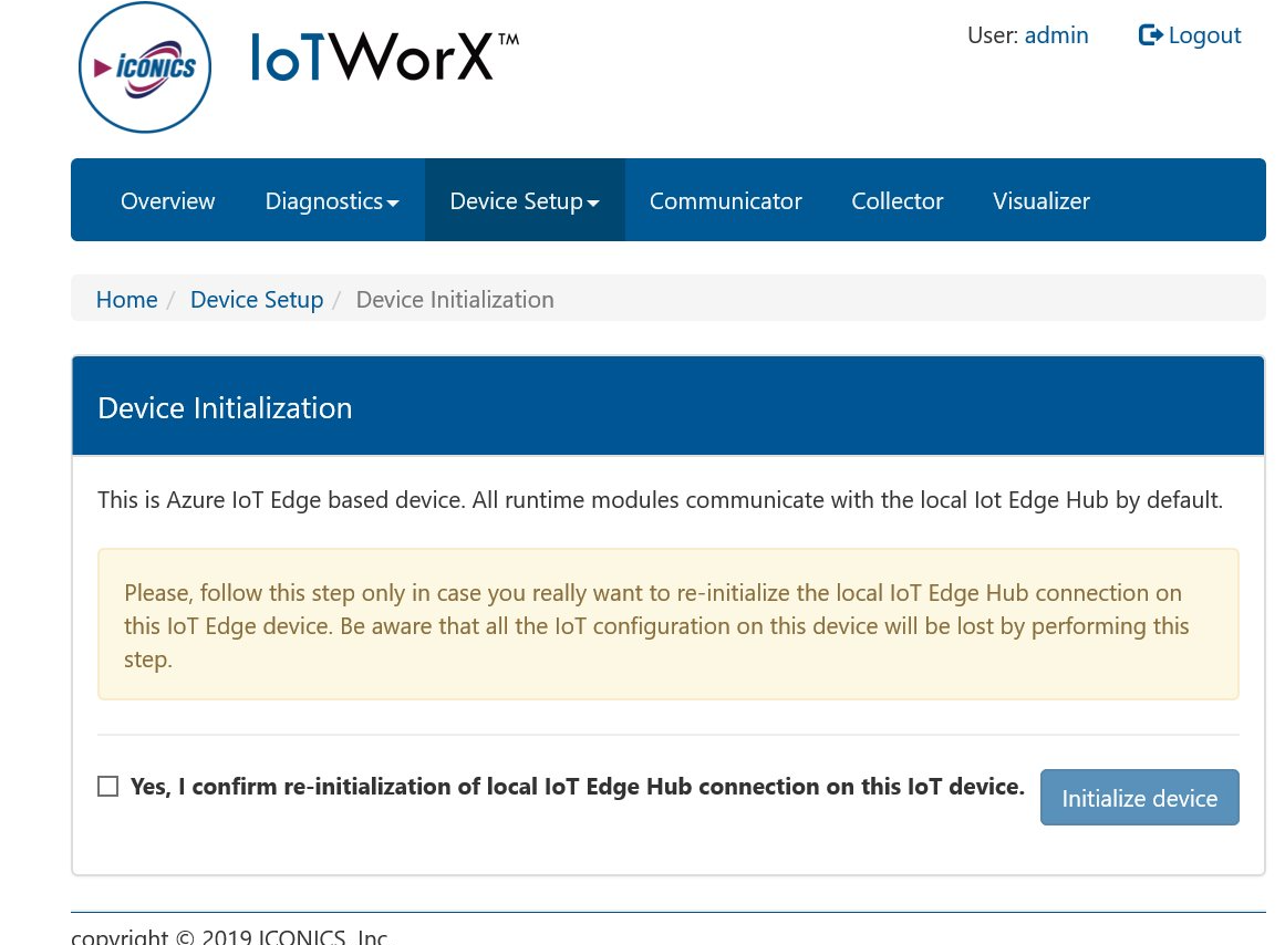 The Device Initialization option, shown below, in the Device Setup tab allows you to re-initialize a local IoT Edge Hub connection on the IoT Edge device.