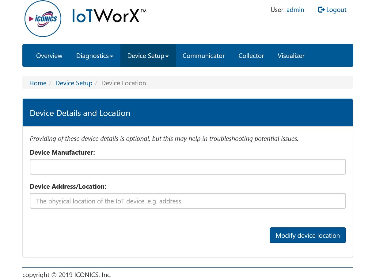 The Device Location option, shown below, in the Device Setup tab allows users to provide device details and locations. Providing these details is optional, but may assist in troubleshooting potential issues.