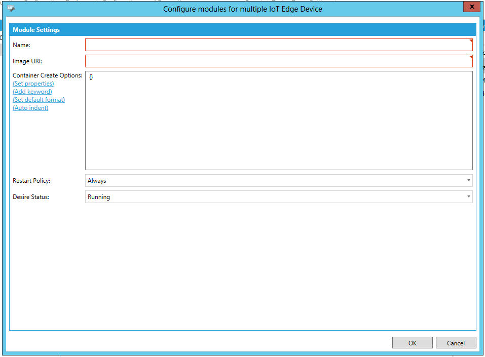 Once you have completed your settings, click the OK button to return to the previous 'Configure modules for multiple IoT Edge Device' properties.