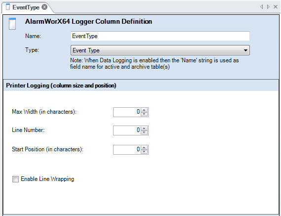 Name - Enter the name of the column. This will be the column name used in the logging database and the column heading when printing.