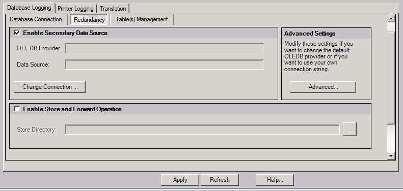means that no stand-by database will be used. If the primary data source becomes unavailable, no alarm events will be written by the logger. To enable redundancy, put a checkmark