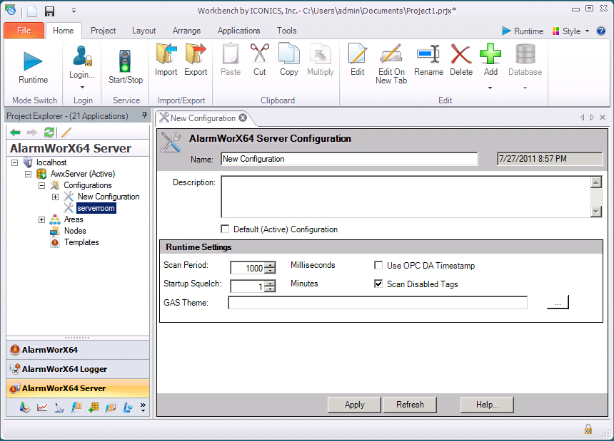When you open the AlarmWorX64 Server from the Start menu Workbench opens and you see configuration forms for the AlarmWorX64 Server. This form allows you to change parameters such as polling rates, how much variation must be recognized in order to create an out of bound condition, and so forth.