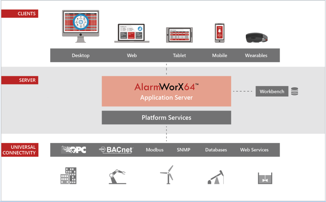 AlarmWorX64 Server is an ICONICS server application that communicates via OPC-DA or OPC UA (where data is passed via FrameWorX OPC-DA Server to convert to OPC-DA). The AlarmWorX64 Server receives field data from any OPC-compliant Data Access server and performs alarm detection and reporting based on the OPC Alarm and Events Standard.