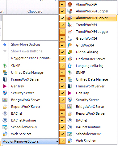 If you do not see the AlarmWorX64 Server listed in the navigation tree control, click the navigation menu and select the AlarmWorX64 Server from the Add or Remove Buttons menu. Once the button has been added to the navigation menu bar you can click the button to have AlarmWorX64 Server appear in the Workbench. The icon for the AlarmWorX64 Server is the red alarm bell shown in the lower left corner.