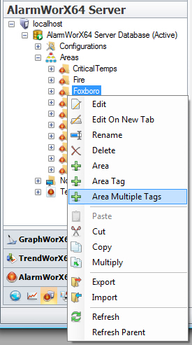 Tip: If you are creating a new configuration, you can copy an existing configuration's Area folder by exporting it from that configuration, then import it into the new configuration. You can also copy individual areas from one configuration to another. For instructions, refer to Exporting and Importing AlarmWorX64 Server Components. |