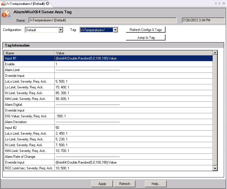 Review the content of the Tag Information section to make sure you have selected the alarm you intended to. If the information doesn't look right or has been changed recently, click the Refresh button at the bottom of the tab to show the latest information about the alarm tag. If necessary, choose a different configuration or tag from the top of the tab.