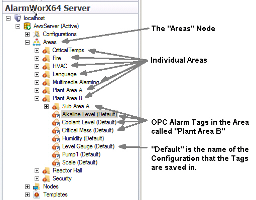 In your active AlarmWorX64 Server configuration, there are a myriad of OPC alarm tags that represent the inputs coming from any number of sources. You can group these alarm tags into areas. An area is nothing more than a folder that you create in AlarmWorX64 for a physical area in a plant, a category of sensor, or a grouping of machines or types of equipment. It can be any category for classifying alarms. They can even overlap so that OPC tags may belong to more than one area. Not only do these groupings let you manage and find alarms more easily in the configuration, but this information can be used by clients for filtering purposes. Click here to see Areas in the AlarmWorX64 Server configuration tree.