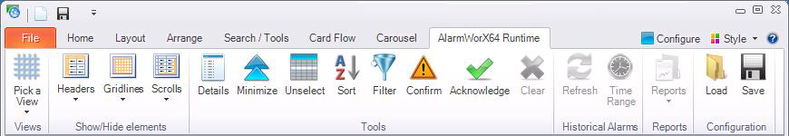 At runtime, an AlarmWorX Viewer has its own runtime toolbar and runtime ribbon.