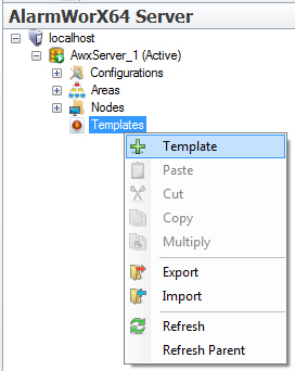 In AlarmWorX64 Server's Project Explorer, expand the navigation tree to expose the Templates node and its template.