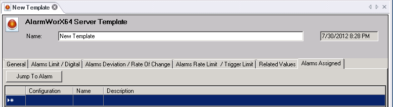 The steps for defining a template are the same as for defining an individual alarm tag. The form for creating a template is nearly identical to the form for creating an alarm tag. One major difference is that the template form has one additional tab, the Alarms Assigned tab, where you can see the alarm tags that reference the template.