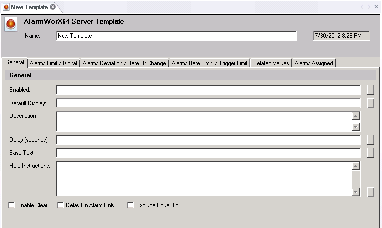 In the Project Explorer, right-click the template in the AlarmWorX64 Server navigation tree, then select Edit or Edit on New Tab. The AlarmWorX64 Server Template form appears.