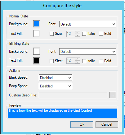 Next, in the Visual Styles Management section of the Condition tab, if you double click within any cell in the column and then click the ellipsis [...] button that appears, you will open the Configure the Style dialog box, shown in the figure below. You can specify the way in which a alarm, when triggered based on the conditions you have specified, appears in the list. The dialog box below shows the style used for the Acked alarm condition.