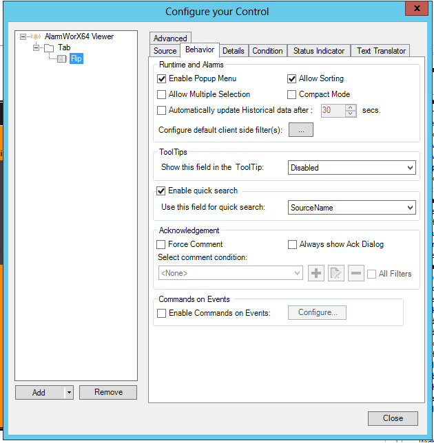 The Flip object has a large set of options that you can set. Some of these objects such as the data source and the assignment of columns are mandatory, as they set the nature of the data that you see in your alarm display. Other settings are optional, primarily the ones that affect how the data is displayed: setting for grouping data, applying a list of conditions, and displaying a set of status indicators. When you select a flip object in the configurator you see a dialog box with the flip's Source tab displayed.